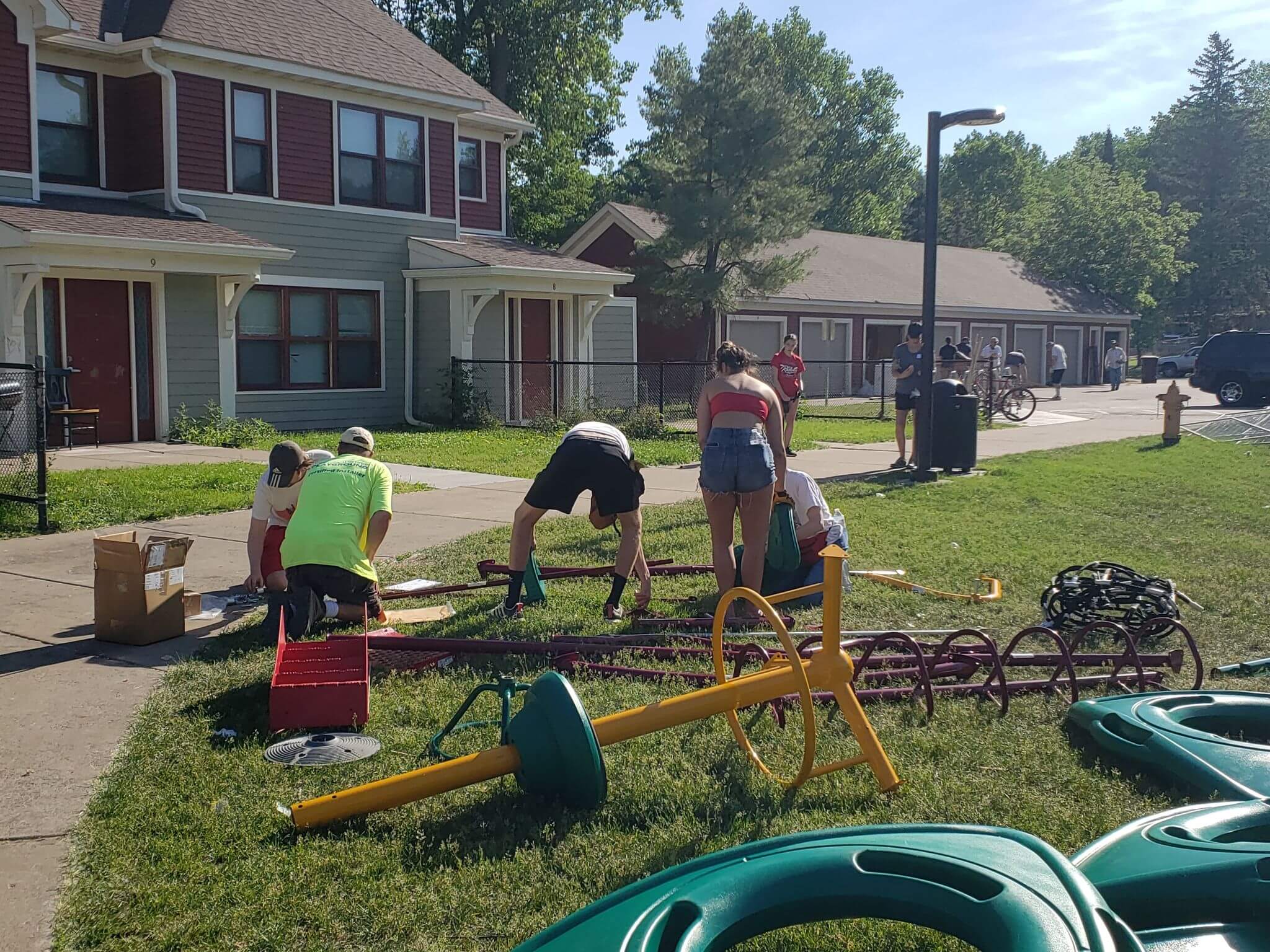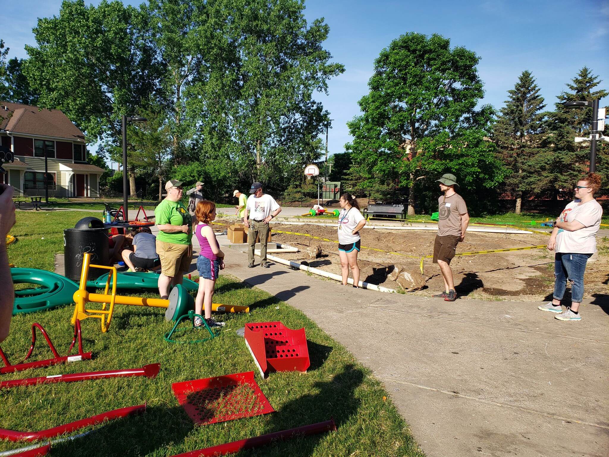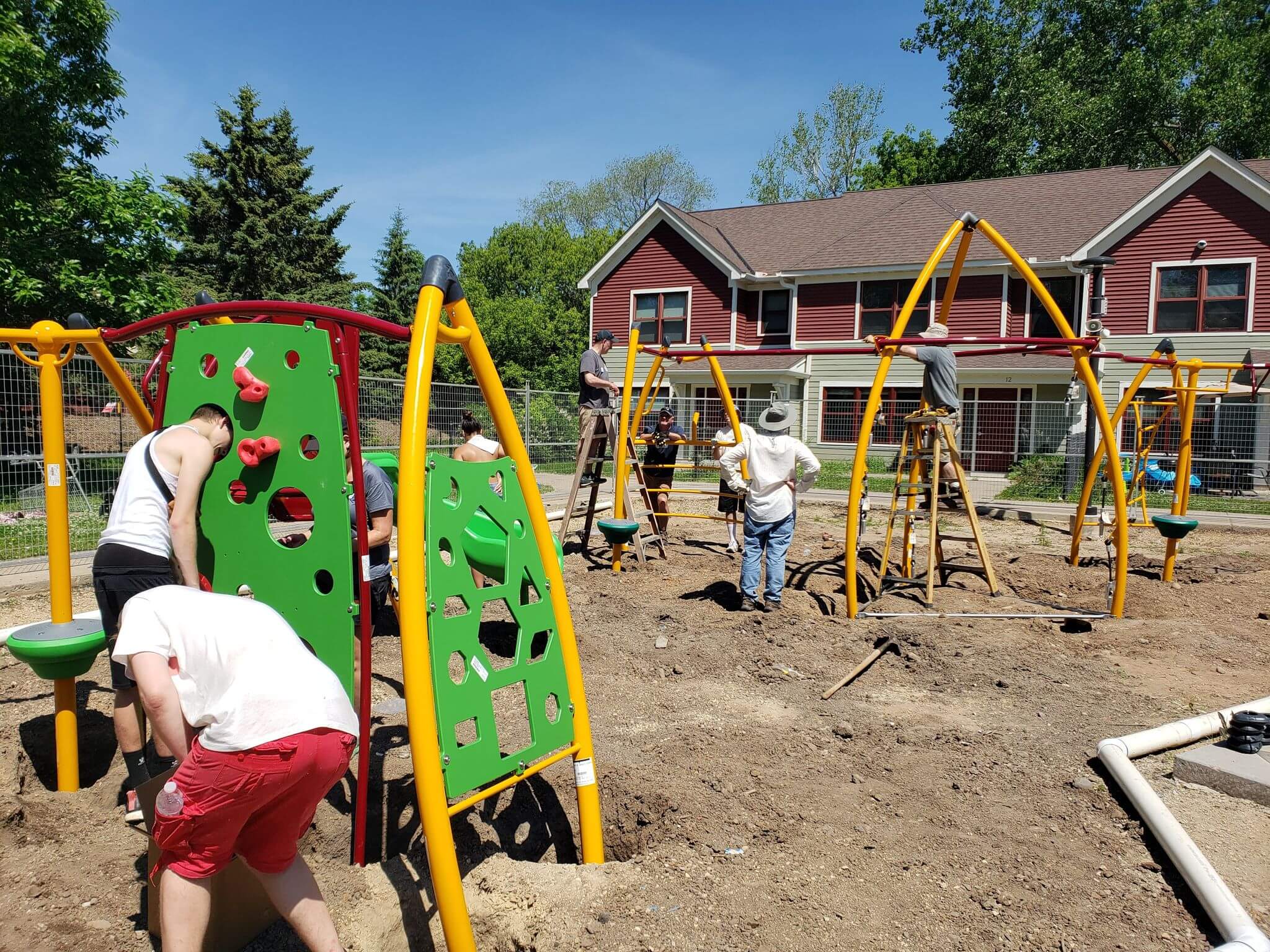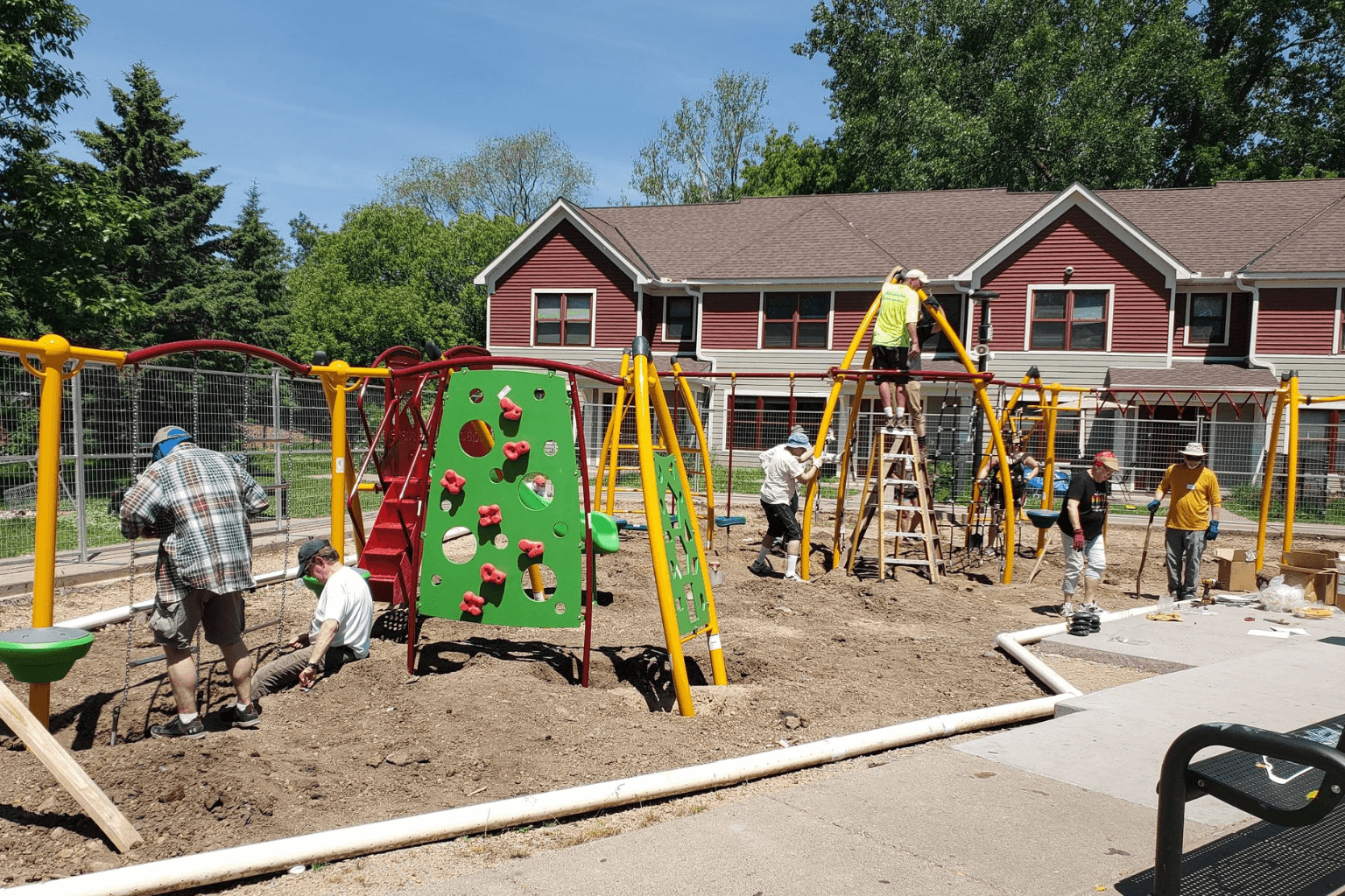 It’s a testament to the how caring and engaged our community is that we were still able to get a dedicated group of volunteers to come to build the playground on June 5th! Volunteers from Hamline Church, Haunted Basement, and other community members and staff worked in record-breaking heat starting at 7 AM, and every pair of hands made the work lighter.