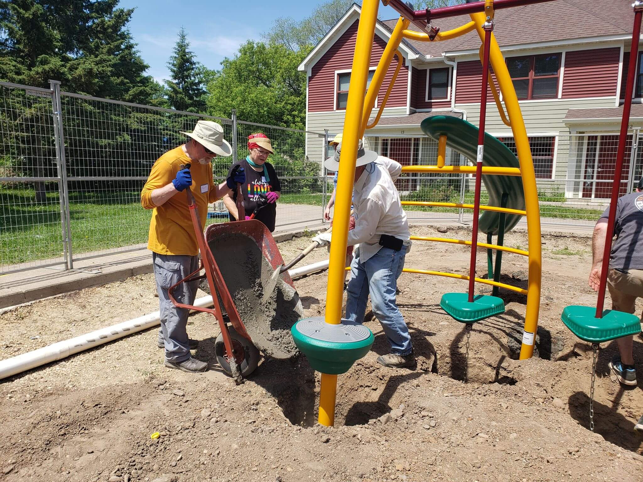 Once the concrete started flowing, the build wrapped up remarkably fast! We put the last pieces of equipment in place, and tightened the final screws, and cleaned up stray concrete splashes. Finally, we put up fencing around the playground in order to keep kids safe and off the playground while the concrete dries and the mulch was blown in. (We knew the kids wouldn’t be able to resist otherwise!)